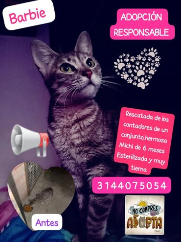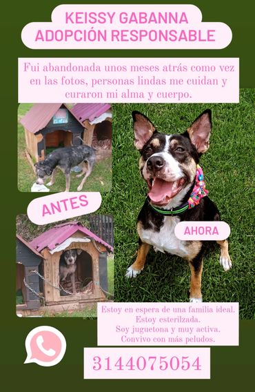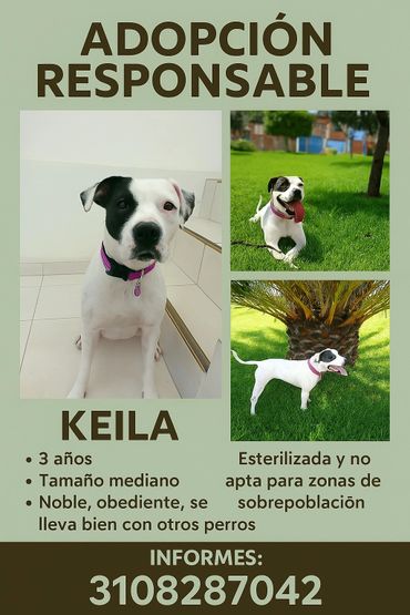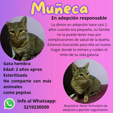 Hembra, 4 años. Tamaño mediano. Muy tranquila, acostumbrada a estar en interiores, ideal como primera mascota.